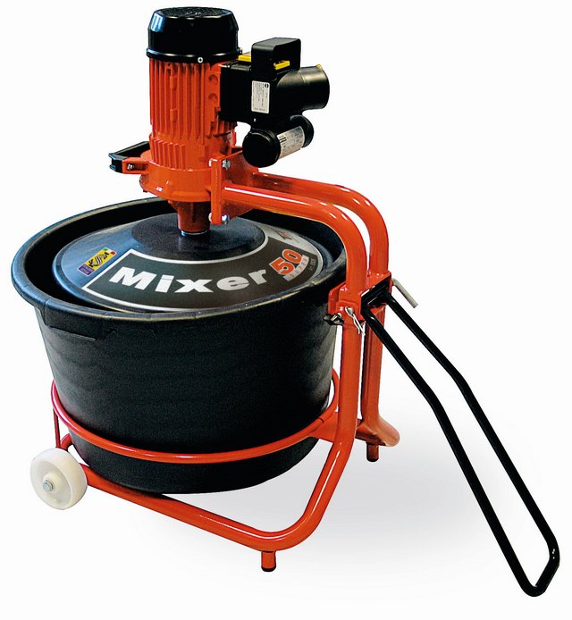 Univerzalna miješalica za ljepila za pločice, cement, boje, epoksidne smole, opremljena sa: monofaznim motorom 230V~50Hz 1,6 Hp / 1,2 Kw, plastičnom kantom od 65 l, te mješačem. Za pravilno korištenje, materijal se mora izliti izravno na crnu plastičnu zaštitu i potom centrifugirati za pravilno miješanje. Samostalno miješa do 50 kg materijala. Uštedite vrijeme i novac! Automatski sigurnosni prekidač sprječava pokretanje motora kada je glava za miješanje potpuno podignuta. Miješalica je lako prenosiva zahvaljujući kotačićima i ručki za transport.