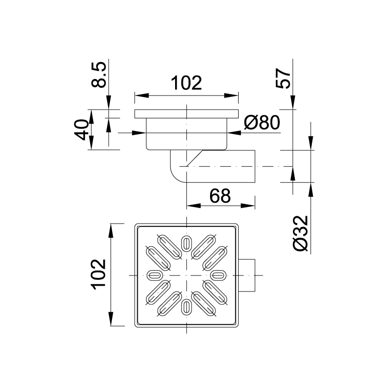 Podni sifon, horizontalni, 100x100 mm, fi 32 mm