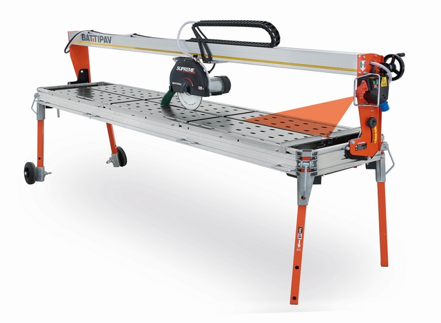 SUPREME je mosna pila idealna za rezanje prirodnog kamena, granita i mramornih ploča. Obavlja rezove ručnim pomicanjem motora prema naprijed. Napravljen je za rad s dijamantnom pločom promjera 300 mm. Laserski instrument i komplet kotača isporučuju se standardno ili kao dodatna oprema. Opremljena je: -prekidač sa zavojnicom za otpuštanje – zaštita od pregrijavanja s ručnim resetiranjem -klizna rezna glava i nagibni motor -sustav naprednog rezanja s ručnim kotačićem -laserski instrument -komplet kotača -podesive noge -podesiva goniometarska ograda -pumpa za vodu tipa S3 Disk promjera 300 nije uključen.